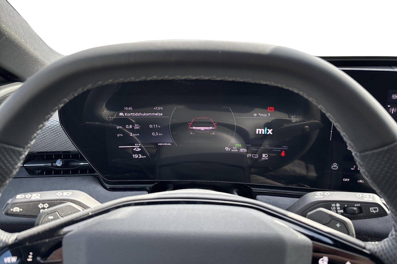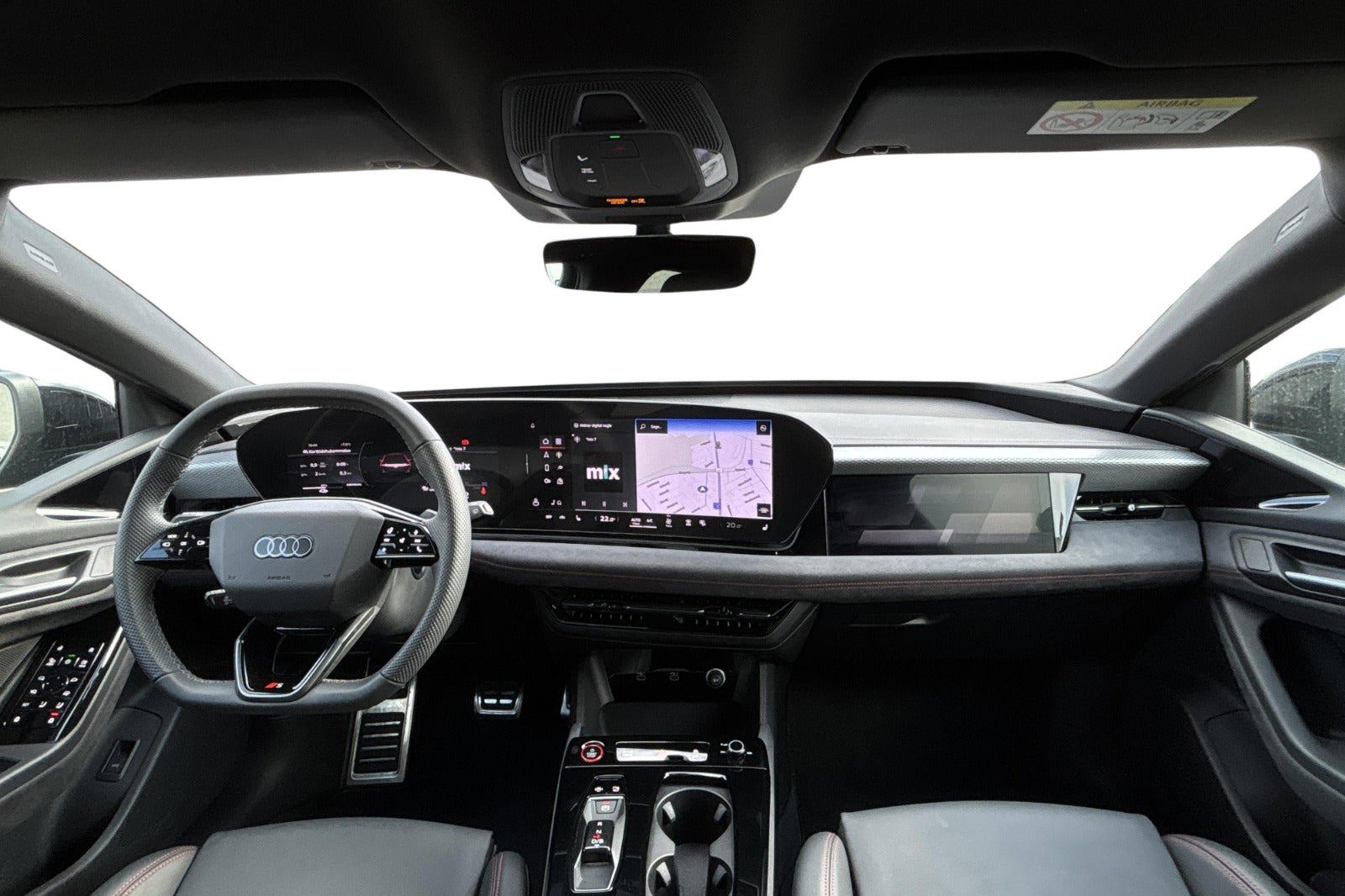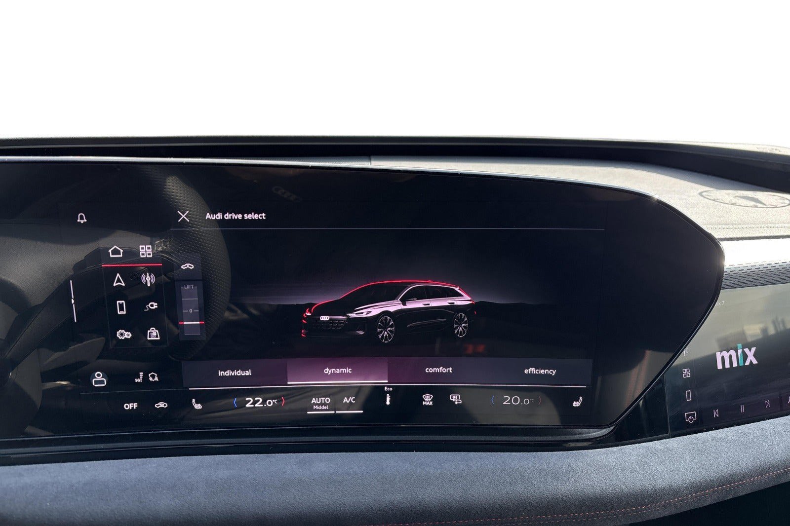 * Udvalgs standardudstyr * Adaptiv luftundervogn * Digitale OLED-baglygter * S line * S line interiør med sportsæder i sort stof-kunstlæder- kombination * Elektrisk ratindstilling * Elektrisk lukkehjælp til døre * Garageportsåbner * Adaptiv kørselsassistent plus herunder adaptiv fartpilot * Sportsforsæder med elektrisk indstilling * Memoryfunktion for førersædet og sidespejlene * Matrix LED-forlygter * Digitale lyssignaturer * Vognbaneafvigelsesadvarsel inklusiv nødsituationsassistent * Proaktiv passagerbeskyttelse til front side og bag * MMI-passagerdisplay * Sideairbags bagi * Trådløs opladning til smartphone * E-tron sportslyd * Holdeassistent * Omgivelseskameraer * Parkeringsassistent plus * Parkeringssensor for * Parkeringssensor bag * Audi Smartphone Interface med Apple CarPlay og Android Auto * Stofindtræk * Komfortnøgle * Digitalnøgle * 3 zoners klimaanlæg * Elektrisk ladeklap * AC ladetilslutning på begge sider af bil * Akustiske sideruder foran * Interiør med sportssæder i sort stof * Vognbaneafvigelsesadvarsel * Frunk * Træthedsregistrering * Bluetooth * Isofix * Armlæn * Kopholder