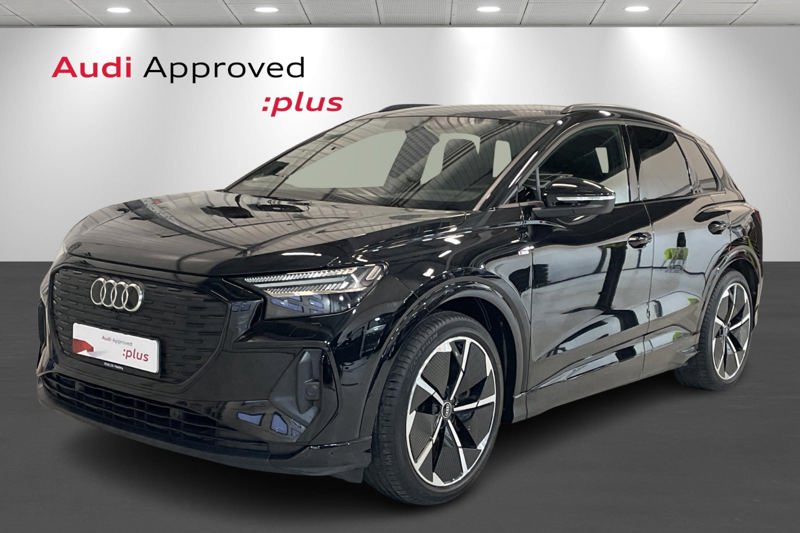 Udvalgt standardudstyr i Q4 e-tron: * Dansk bil med Varmepumpe * LED forlygter og baglygter * Undvigeassistent og drejeassistent * Komfortparkeringsklimafunktion * Klimaanlæg automatisk * Vognbaneafvigelsesadvarsel * Sædevarme foran * 19" alufælge 5-eget design * Audi pre sense front * Audi sound system * Børnesikring, elektrisk betjent * Børnesædefastgørelse i-Size i passagersiden og i-Size og * Top Tether på de yderste bagsædepladser * Dekorindlæg i sort eksklusiv lak * Digital radiomodtagelse * Digitalt cockpit 10,25” * Multifunktionssportslæderrat flad top og bund og skiftekontakter * Forsæder med højdeindstilling * Højglanspakke blanke rudelister * Komfortmidterarmlæn foran * Mode-3-ladekabel * Sidespejle med elektrisk indstilling og elopvarmning * Sidespejlhuse i bilens farve * Splitbagsæde 40:60 * Tagræling blank