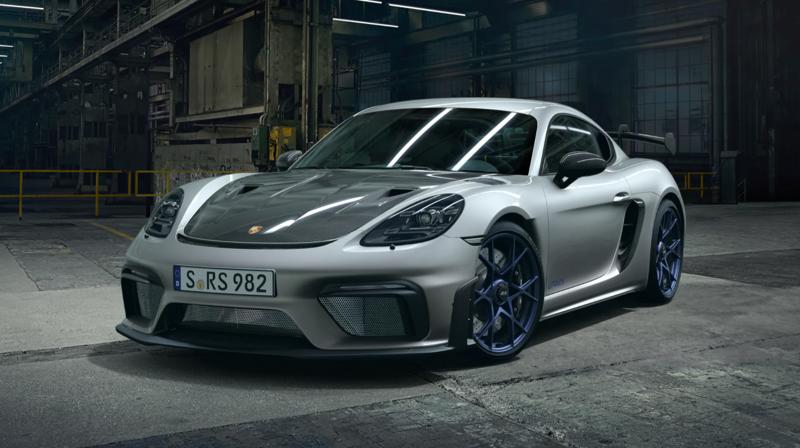 Highlights: • GT Silver Metallic • 20" 718 Cayman GT4 RS hjul, smedet aluminium, lakeret i Indigo Blue • Race-Tex interiør med læderdetaljer, Weissach-pakke, sort, inkl. kontraster i Deep Sea Blue • Club Sport Pakke • Løftesystem, foraksel • 90-liter brændstoftank