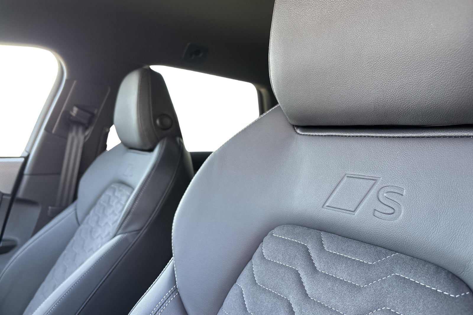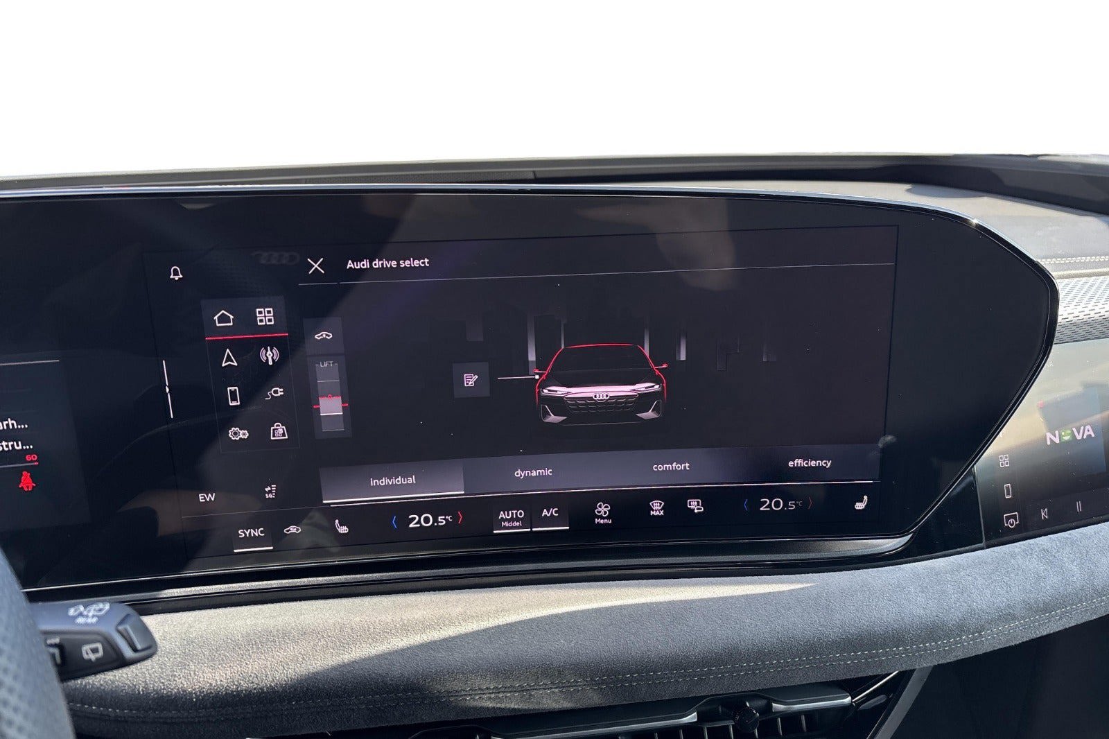 Udvalgt standardudstyr: * Adaptiv luftundervogn * Digitale OLED-baglygter * S line * S line interiør med sportsæder i sort stof-kunstlæder- kombination * Elektrisk ratindstilling * Elektrisk lukkehjælp til døre * Garageportsåbner * Adaptiv kørselsassistent plus herunder adaptiv fartpilot * Sportsforsæder med elektrisk indstilling * Memoryfunktion for førersædet og sidespejlene * Matrix LED-forlygter * Digitale lyssignaturer * Vognbaneafvigelsesadvarsel inklusiv nødsituationsassistent * Proaktiv passagerbeskyttelse til front side og bag * MMI-passagerdisplay * Sideairbags bagi * Trådløs opladning til smartphone * E-tron sportslyd * Holdeassistent * Omgivelseskameraer * Parkeringsassistent plus * Parkeringssensor for * Parkeringssensor bag * Audi Smartphone Interface med Apple CarPlay og Android Auto * Stofindtræk * Komfortnøgle * Digitalnøgle * 3 zoners klimaanlæg * Elektrisk ladeklap * AC ladetilslutning på begge sider af bil * Akustiske sideruder foran * Interiør med sportssæder i sort stof * Vognbaneafvigelsesadvarsel * Frunk * Træthedsregistrering * Bluetooth * Isofix * Armlæn * Kopholder