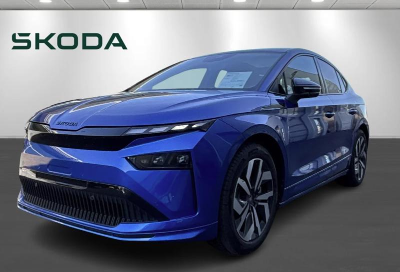 Skoda Enyaq Sportline Coupé - Klar til levering Farve: Race Blue metallak Indtræk: Sportline (sort alkantara stof med sort dellæder), sportrat, sort himmel og dekorelementer i carbon design)