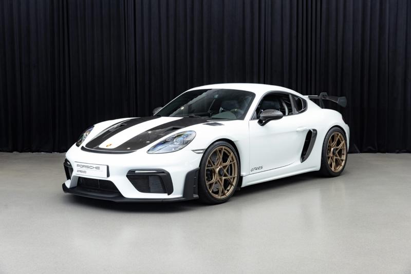 Highlights: • Hvid • 20" 718 Cayman GT4 RS hjul, smedet aluminium, lakeret i silkemat Neodyme • Fuldskålsæder • Løftesystem, foraksel • Porsche Ceramic Composite Brake (PCCB) • 90-liter brændstoftank